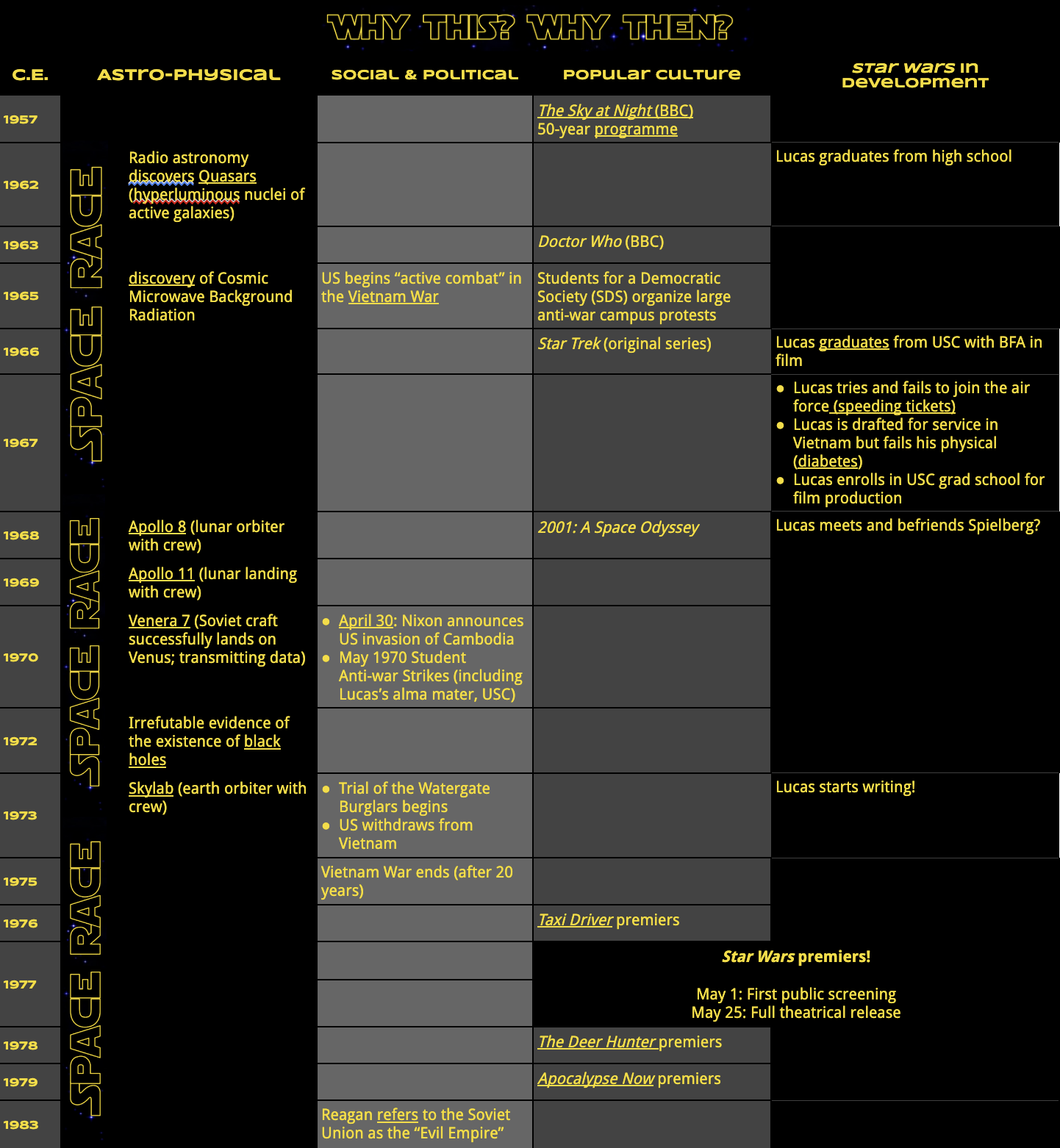 But it wasn’t just space nerds who were hot for space—regular everyday nerds like you and me were hot for it, too! Basically, Lucas grew up in a cultural landscape obsessed with exploring the cosmos. (Fun fact: George Lucas graduated from high school in 1962, the same year that quasars were discovered!)