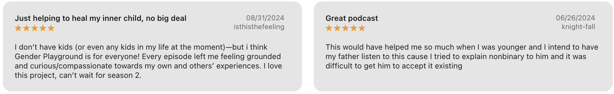 Making the second season of Gender Playground has given me the chance to hear from folks navigating gender and child-rearing in an increasingly scary world. The scariness is real and it sucks, and so far no one has written in to say “Everyone move here, the governance system is perfect.” But it has been so healing to hear from adults all over the world who are committed to making the planet a safe and loving place for queer, trans, and nonbinary kids. We had listeners send us voicemails from Australia, Germany, and across Turtle Island (North America). That’s amazing! We might be spread out, but we aren’t alone.