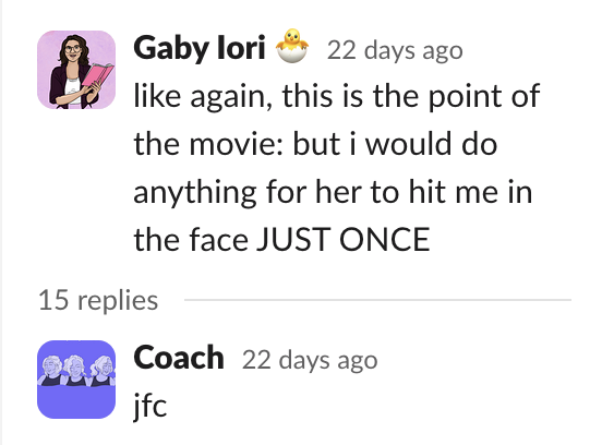It’s a two-parter! 1) What movie was Gaby talking about? 2) Which CHARACTER was Gaby talking about? First person to guess correctly will get a shout-out on social for this very stupid little game. Email us at ohwitchplease@gmail.com if you have a guess!