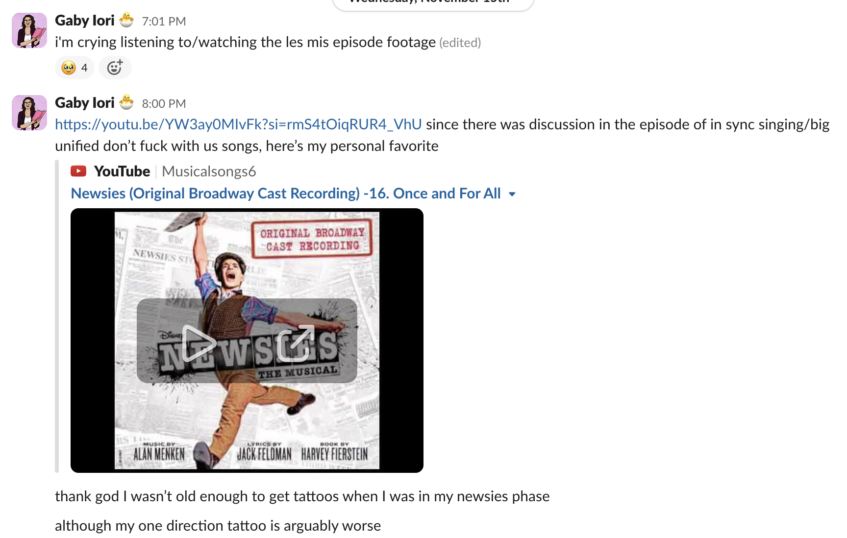 Gaby had a HUGE Les Mis phase as an impressionable teenager, so this episode rocked for her. She also gets vulnerable and shares her love of Newsies AND the fact that she has a One Direction tattoo. Is this lore fun for you?