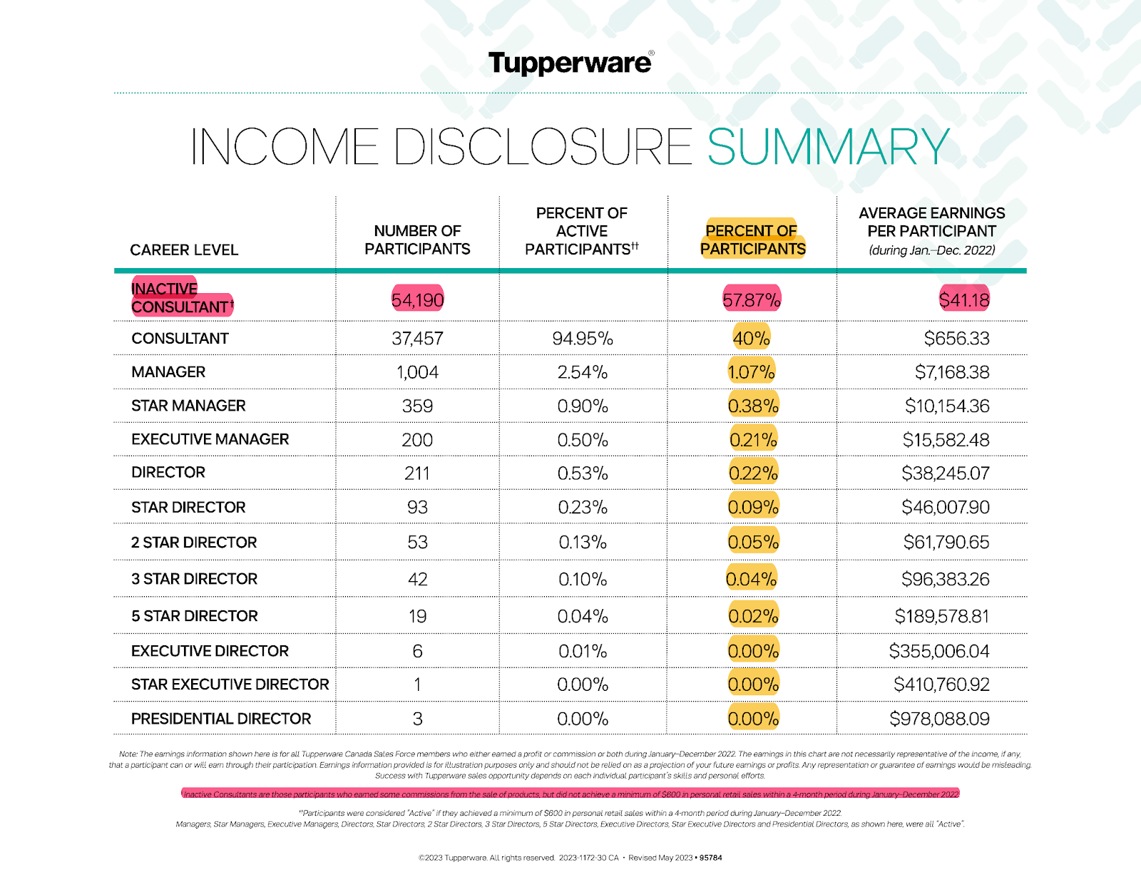 I may have only gotten a B- in my undergraduate statistics class (maybe I should have skipped some of those sex toy parties and stayed home to study), but I’m pretty confident that omitting 57.87% of Tupperware consultant income is a wildly misleading way to analyze this data. So, for this exercise, I insist that we use the inclusive numbers I’ve highlighted in the column labeled “Percent of Participants.” According to Tupperware’s own income disclosure for 2022, less than a quarter of one percent of salespeople reached the “Director” level. In real numbers, that means 211 people earned an average of $38,000. By contrast, 54,190 people (that’s more than half of Tupperware’s 91,647 “consultants”) didn’t even earn enough money to be counted as “active.” And Tupperware, I can’t stress this enough, is considered a successful and legitimate MLM.